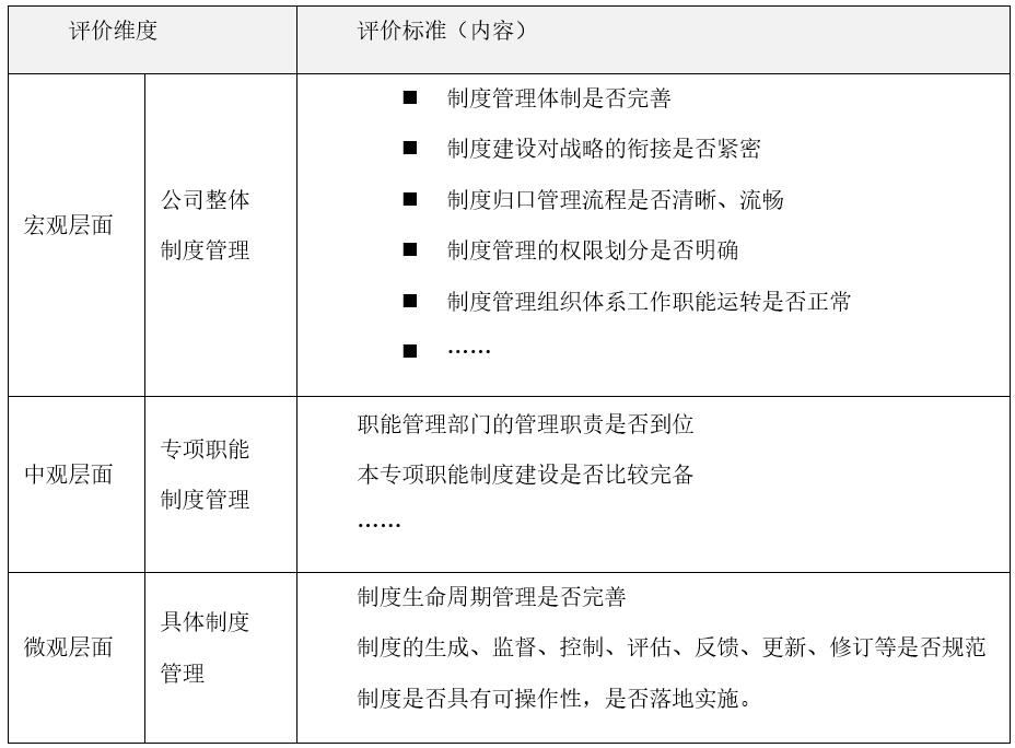 对于制度管理体系的评估,通常从宏观管理(企业总体制度管理)、中观管理(专项职能制度管理)和微观管理(单体制度管理)三个层面进行分类评估,每个层面评估工作的侧重点不同,其中: