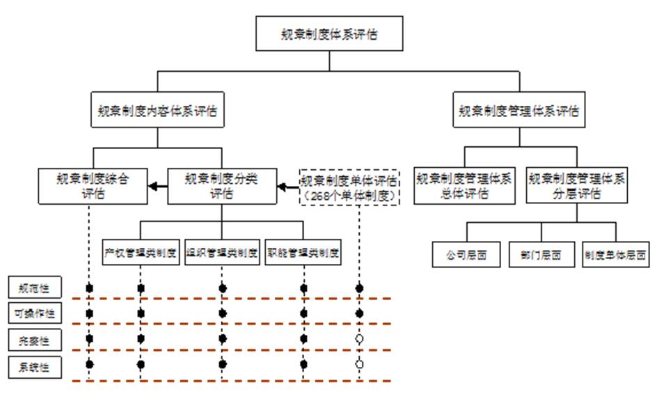 对规章制度管理体系的评估分为总体评估和分层评估两个维度。总体评估主要从规章制度管理整体层面阐述制度管理的情况。