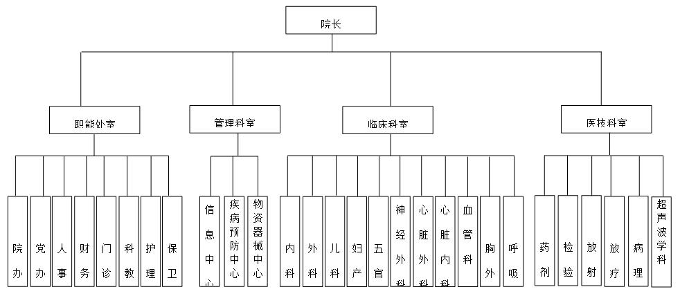 N医院成立于1990年,是以治疗心肺血管疾病为重点的大型综合性医院。医院占地面积5万平方米,医疗用房9万平方米。现有职工近1000人,其中高级专业技术人员100余人。临床、医技科室15个,床位500余张。具有现代化设施和人文理念的心胸血管外科大楼,具有百、万级净化层流手术室20间,术后监护病床30张,新建的门诊综合楼2.8万平方米,为患者提供的人性化医疗服务。心脏外科、心脏内科、血管科、胸外科、呼吸内科是医院的重点特色科室,医院的组织结构图如下: