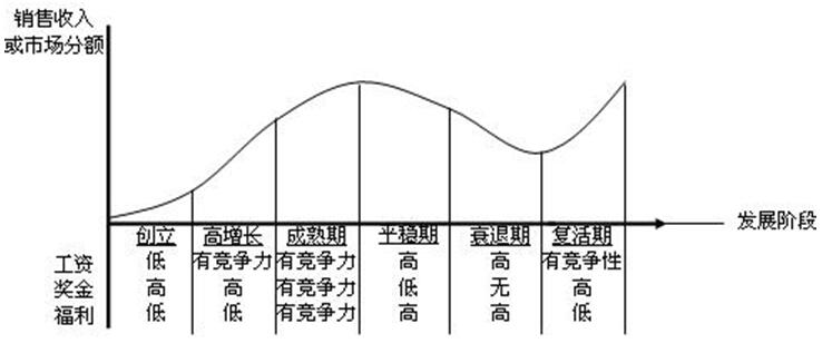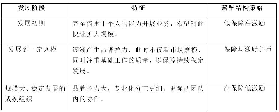 在实际应用中,一般都是绩效薪酬和基本薪酬各占一定的比例。当两者比例不断调和变化时,这种薪酬模型可以演变为以激励为主的模型,也可以演变为以稳定为主的薪酬模型。伴随着组织的发展,不同的发展阶段薪酬结构策略也是不尽相同的,如以下图表所示: