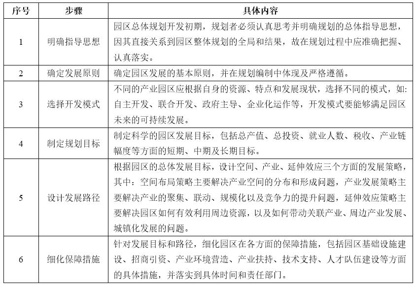 针对上述问题,各产业园区都在探索各自的发展道路,如:争取政策支持、产城融合、突出技术优势,等等。通常来看,产业园区规划大致包括如下六大步骤,如下表所示: