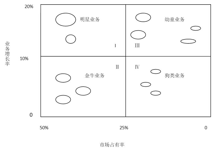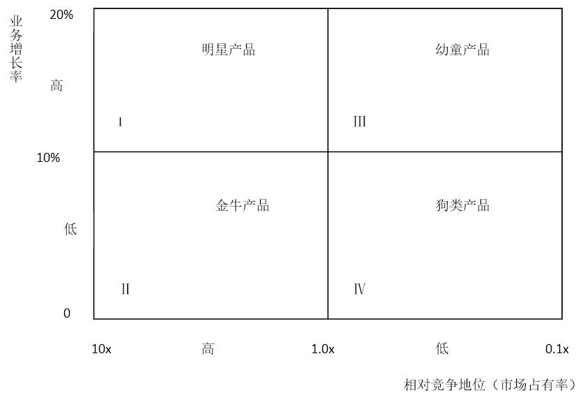 波士顿矩阵(BCG矩阵)是由美国波士顿咨询公司率先提出的、对企业当前的业务组合进行分析、评价的战略管理工具。它把公司经营的全部产品和服务的组合作为一个总体来看待,故也称“统筹分析法”。这种方法假定企业由两个以上的经营单位组成,每个单位的产品有明显的差异并具有不同的细分市场。在拟定每个产品的发展战略时,主要考虑的是它的相对竞争地位(市场占有率)和业务增长率。以前者为横坐标,后者为纵坐标,分为四个象限,企业各经营单位的产品按其市场占有率和业务增长率高低填入相应的位置,形成矩阵。