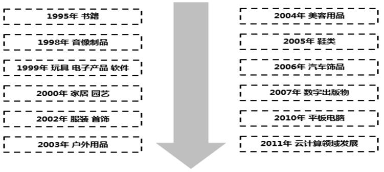 多年来,亚马逊并不满足于电子商务领域,而是放眼全球的电子商务潮流,积极、持续地进行战略扩张。首先,从网上书店扩张为网上综合零售店,并在此过程中成功击败诸多对手。在此基础上,提高服务质量,不断扩大战果。包括:与多位知名作家签约,独家出版其作品,收购网上鞋店Zappos和网上婴儿用品店Diapers等多家企业。在商品流通环节,亚马逊则逐步缩短其配送周期,从2005年开始,它向用户提供两天即达的快递服务Amazon Prime(年费79美元),在某些地区(如:西雅图),亚马逊还尝试食品、菜蔬当天送货。