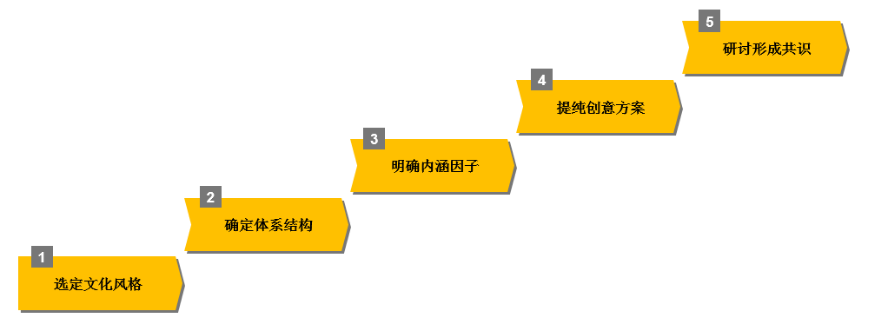 4、提纯创意方案:由专业人士根据既定的文化内涵提出文化理念的创意,并反复进行研讨、提纯、提升,形成文化理念体系。