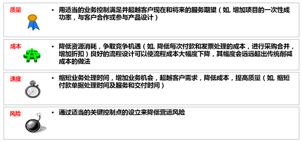 企业在建立初期,主要面临的问题是业务流程的建立和规范,发展中期则主要面临的是流程的优化与完善,随着企业进入成熟期,战略面临重新设计与变革,流程方面面临的问题也就不仅仅是小的偏差和效率问题,而是影响企业生存和发展的本质性偏差,例如: