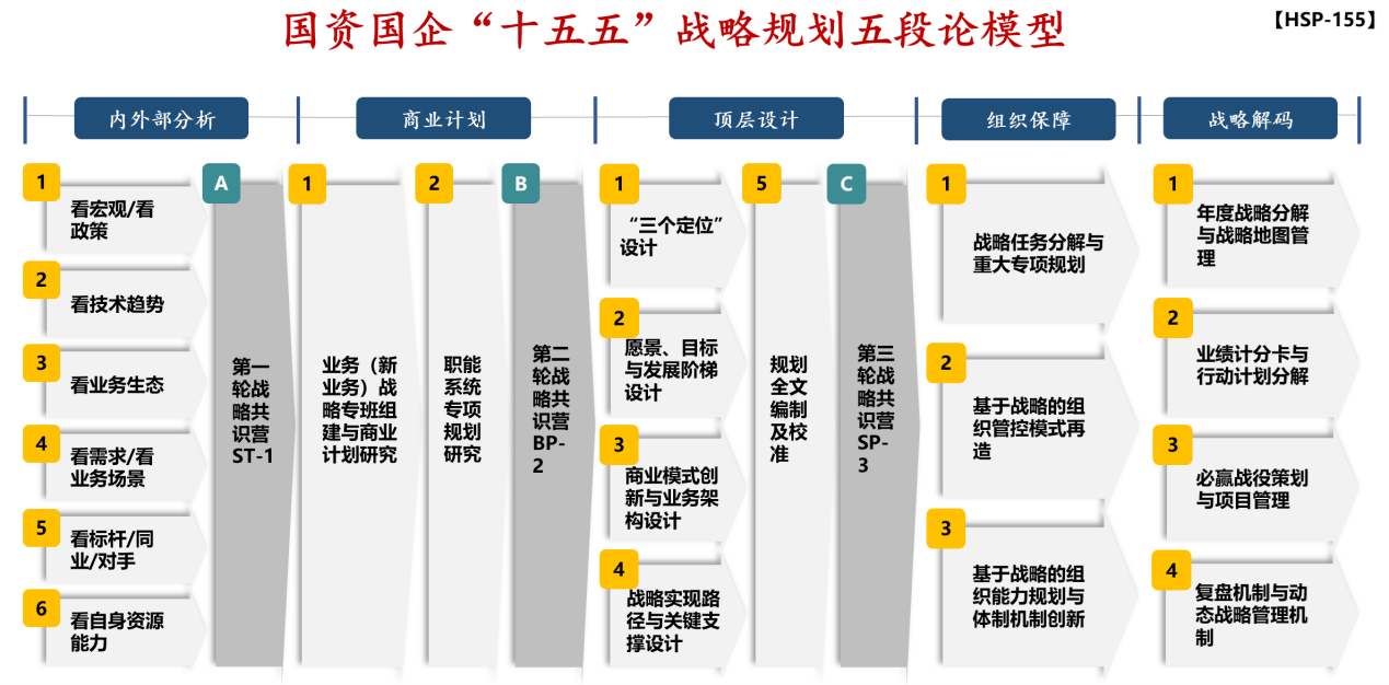 针对上述矛盾,结合本公司原创的国资国企十五五战略规划五段论模型(内外部分析、商业计划、顶层设计、组织保障、战略解码),构建国企十五五规划的系统解决方案,实现战略引领、能力升级、价值创造的三位一体。