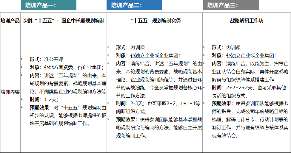 (三)内容:演练结合,讲述“五年规划”的由来,本轮规划的背景要素,战略规划基本理论,企业规划编制流程等;并通过各环节的实战演练,令全员掌握规划各核心环节的工作方法,包含不限于: