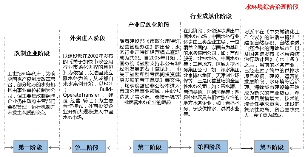 以北控水务、首创股份、碧水源为代表的企业一马当先,各地方水务水利集团与水务上市公司(中山公用、国祯环保、兴蓉环境、重庆水务等)、环境投资公司、具有工程优势和资金实力的中央企业、园林绿化企业也纷纷杀入其中。市场呈现如下六个方面的典型趋势: