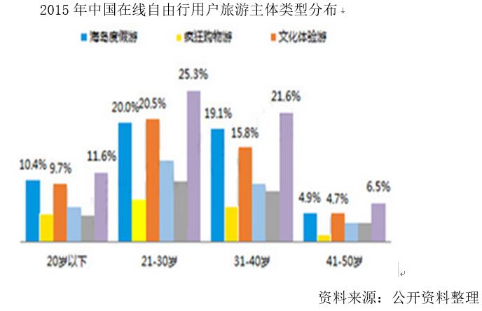 从自由行主题角度来看,50.7%用户偏好文化体验游,而且该主题的旅游渐向20-40岁青年、中年群体拓展。可见,文化旅游渐渐受到旅客的追捧,市场空间不断扩大。