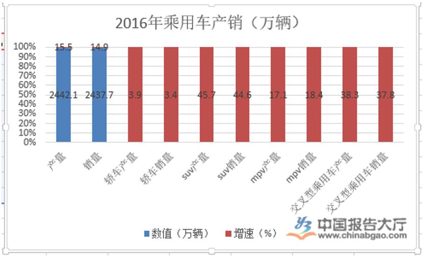 (1)乘用车占据市场主导地位。乘用车的消费属性正在从“可选消费”到“刚性消费”的转变过程中, 销量增长的驱动因素仍然是一二线城市的换购需求和三四线城市的首次购车需求,另外,三四线城市的二次购车需求正在启动中,这也将成为未来几年拉动行业增长的主要驱动力。数据显示,2016年,国内汽车产销分别完成2811.9万辆和2802.8万辆,较2015年分别增长14.5%和13.7%。乘用车方面,2016年产销分别完成2442.1辆和2437.7万辆,较2015年分别增长15.5%和14.9%,其快速增长对于汽车产销增长贡献度分别达到92.3%和94.1%。