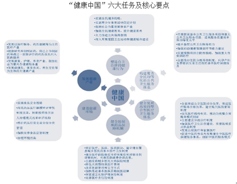 我国《“十三五”规划纲要》明确指出要从全面深化医药卫生体制改革、健全全民医疗保障体系、加强重大疾病防治和基本公共卫生服务、加强妇幼卫生保健及生育服务、完善医疗服务体系、促进中医药传承与发展等八个方面全面推进健康中国建设,其中医改是满足健康需求的根本性手段。