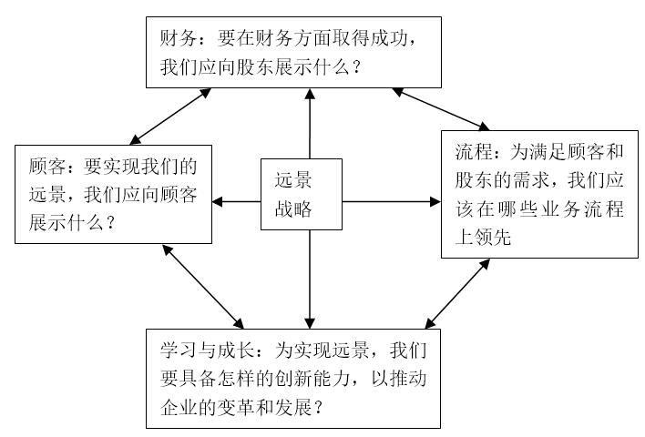 (1)以组织的共同愿景与战略为核心,运用综合与平衡的思想,依据组织结构,将公司的愿景与战略转化为下属各责任部门在财务、客户、内部流程、创新与学习等方面的系列具体目标(即成功因素),并设置相应的四张计分卡。