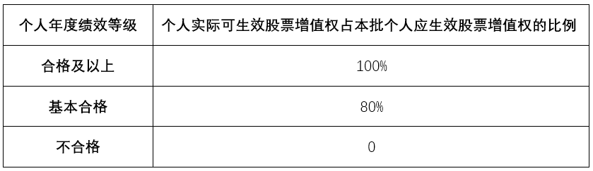 若激励对象某一股票增值权行权期的个人年度绩效等级为基本合格或以上,则其当期绩效表现达到生效条件,在满足其他生效条件下,可以申请当期实际可生效股票增值权的行权;若激励对象的个人年度绩效等为不合格,则其当期业绩表现未达到生效条件,取消其该期股票增值权行权资格。