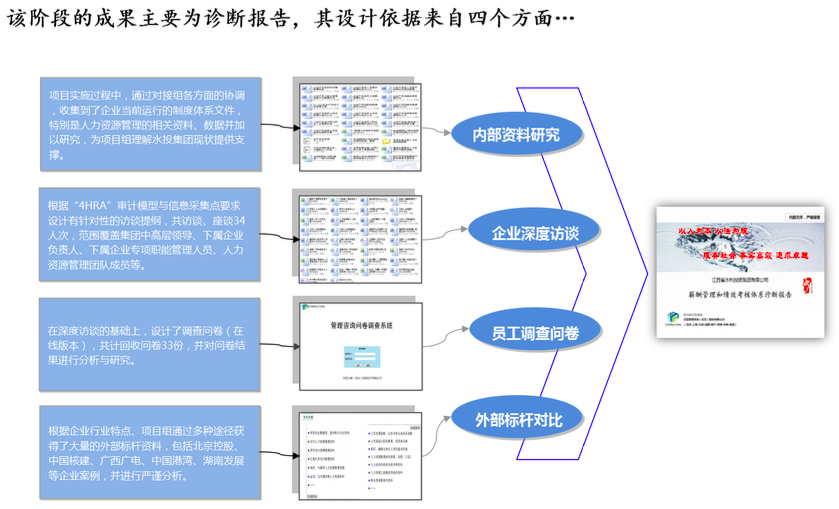 项目启动之初,通过内部资料研究、企业深度访谈、员工调查问卷、外部标杆资料对比,政策研究等维度进行全面诊断,发现问题并提出改进的思路。