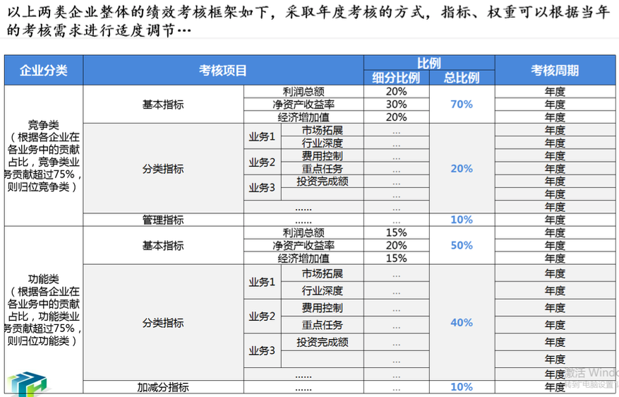 1、优化集团所属子公司经营业绩考核办法。根据集团战略目标和所属子公司的功能定位、业务特点,实行年度考核与任期考核相结合的方式,遵循依法考核、激励与约束并重、分类考核的原则,制定子公司考核指标、考核程序、考核计分办法,形成所属子公司的经营业绩考核办法,保护投资人的合法权益,落实资产保值增值责任,建立有效的激励和约束机制,为实现集团战略目标夯实坚实的基础。