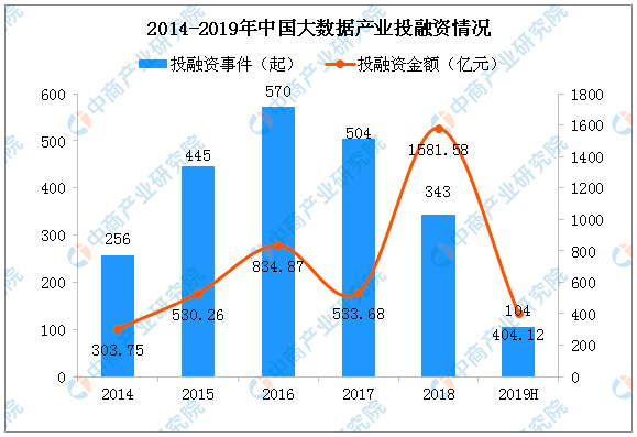 我国大数据领域融资活动逐渐兴起,呈现持续升温的态势。2014年投融资事件256起,投融资金额303.75亿元。此后两年投融资事件数量和投融资金额均持续上涨,2017年投融资事件和金额均有所减少,但是2018年回暖,投融资事件突破1500亿元。2019上半年投融资事件仅104件,但是投融资金额超400亿元,预计全年投融资金额有望超800亿元。