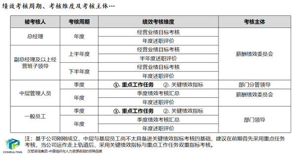 3、绩效体系设计。为确保公司重点工作任务能够由具体岗位更好的承接,绩效考核指标应以量化指标为主。绩效考核要有针对性,对于不同层级,不同类型岗位设计绩效考核体系。绩效考核的可操作性和落地性要强。