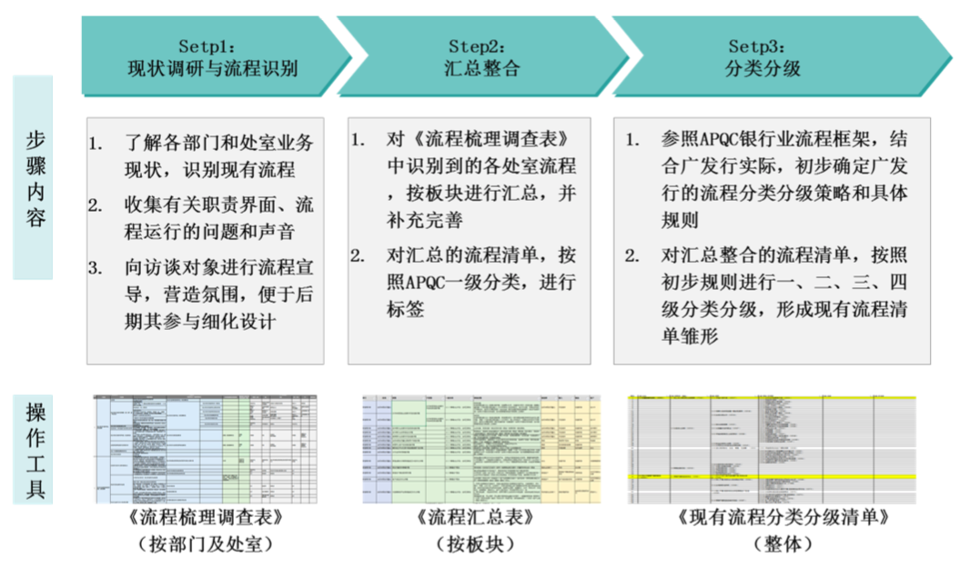 考虑到本次项目的特点,工作组决定采用自下而上的方式开展流程现状调研与清单梳理工作,如下图所示,按照现状调研与流程识别、汇总整合、分类分级三个步骤,并在流程清单梳理的过程中,收集和分析流程问题。
