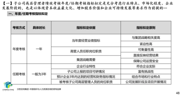 1、优化集团和子公司经营业绩考核办法。根据集团战略目标和子公司的功能定位、业务特点,集团总部实行年度考核,所属子公司实行年度考核与任期考核相结合的方式,遵循战略导向、团队导向、客观公正、分类考核的原则,制定各部门考核指标、考核程序、考核计分办法,形成经营业绩考核办法,提高激励作用,为实现集团战略目标夯实基础。