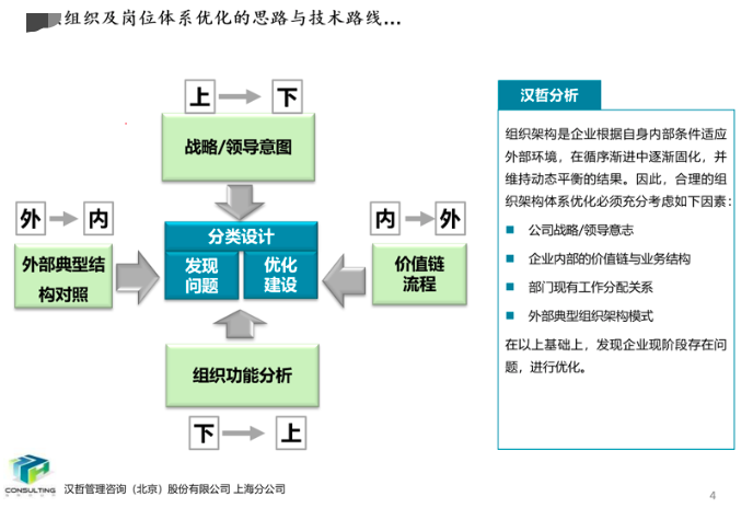 项目组从战略意图、价值链流程、组织功能分析、外部借鉴四个维度对公司的组织体系进行了分析与优化,提出了公司当前的组织架构优化方案以及中长期组织架构优化与调整思路。