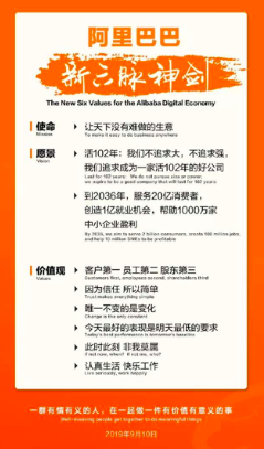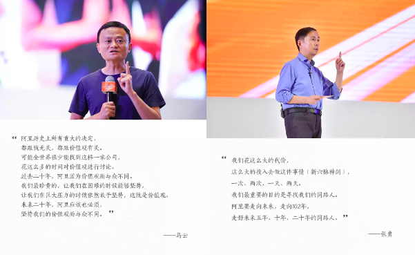 马云说:“可能全世界很少能找到这样一家公司,花这么多的时间对价值观进行讨论。”只为寻找与阿里一起走向未来的“同路人”。过去 20 年,阿里因为价值观而与众不同。未来 20 年,阿里应该、也必须因为坚持价值观而与众不同。接班人张勇说,"我们花这么大的代价、这么大的投入去做这件事情。最重要的目的是寻找我们的同路人,走向未来、走向 102 年,走好未来 5 年、10 年、20 年的同路人。"从"六脉神剑"到"新六脉神剑",是因为使命、愿景、价值观就是阿里巴巴的DNA,过去如此,面向未来,更是如此。