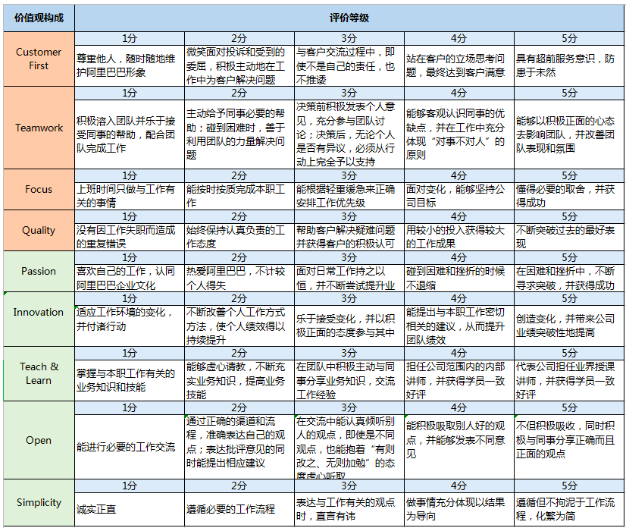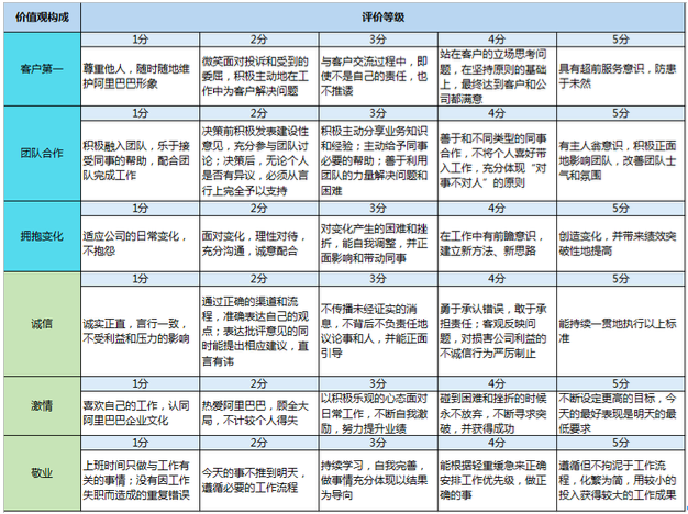 据阿里前HR资深总监陆凯薇介绍,“价值观内容不变,打分变成ABC,与业绩形成两个序列。如业绩为3.75价值观为A,合起来为“3.75A”,3.75只代表业务结果,ABC代表员工的价值观的理解和践行能力。