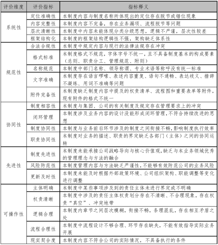 笔者结合项目经验,从系统性、规范性、协同性、先进性及可操作性等五大维度总结了如下制度评估模型,进而为制度评估提供了有效工具。