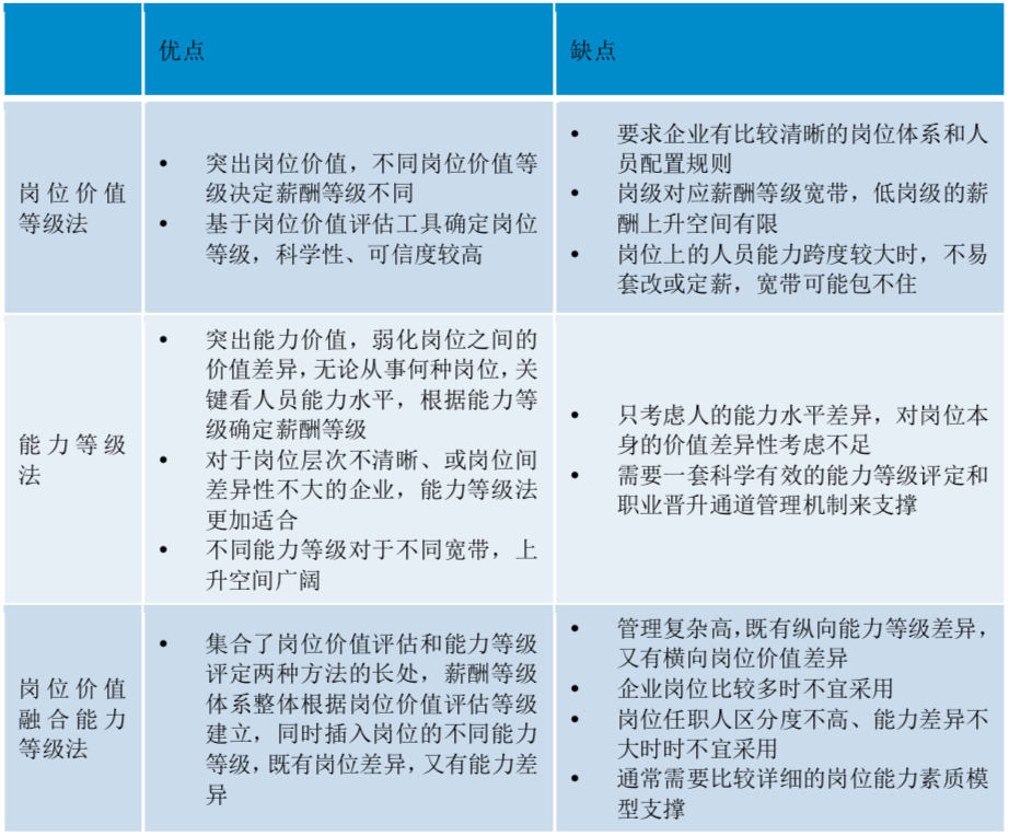 此种方法严格讲不是独立的模式,其实是对以上2种模式的结合,首先根据岗位价值评估结果,确定岗位等级,由此确定基本的薪酬等级,然后在薪酬等级中,再穿插入各岗位对应的能力等级通道。此种方法和第二种方法的区别在于,不同岗位统一能力等级,会在不同的薪级上,而第二种方法,通常情况下只有能力等级的差异,没有岗位等级的差异。