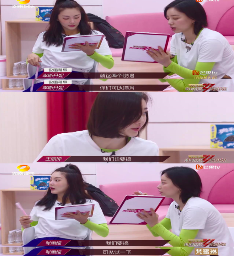 情景7:某次采访中,张雨绮指出李斯丹妮应该多花点时间在自己的团队上,大家多沟通磨合。蓝盈莹想让李斯丹妮过去帮忙教舞蹈,张雨绮直接拒绝,说自己团还没有练习到位,还是一塌糊涂。