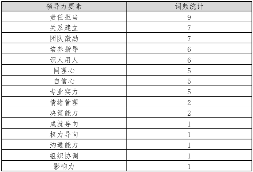 笔者将以上出现的领导力要素进行汇总分析,结果如下表: