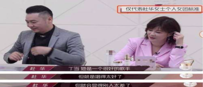 片段2:身为专业唱将的丁当,竟因为“唱的太好”的原因,被杜华打了低分。杜华给出的解释是:“她的能力太突出,会显得其他人太差,所以她个人发展会比成团要好。”