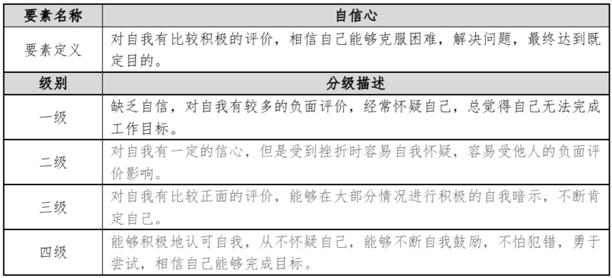 根据上述构建的领导力模型,笔者参考“欧博官网ABG咨询”开发的《HAN-82胜任力模型分类词典》,对此次构建的领导力模型的九个要素分别进行了指标定义及分级标准描述。比如:自信心:
