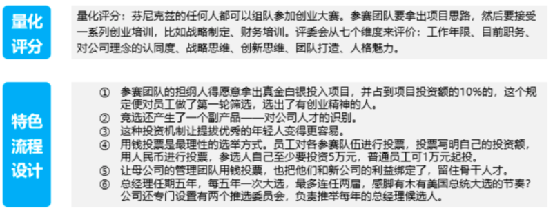 2、用钱投票,可杜绝人情关系,选出最好的创业项目和团队;人人平等,每位员工都可报名参加创业大赛,打破新员工职位无法超过老员工的企业伦理困境。