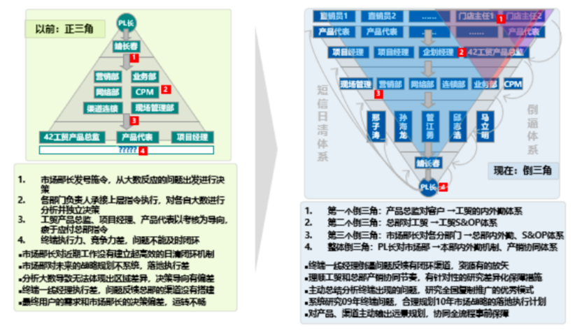 3、量化授权。推行倒三角必须面对经营权下放的问题,如何开展量化的经营授权,预防风险;