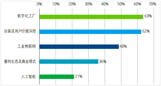 当前,中国工业企业智能制造五大部署重点依次为:数字化工厂、设备及用户价值深挖、工业物联网、重构商业模式以及人工智能。