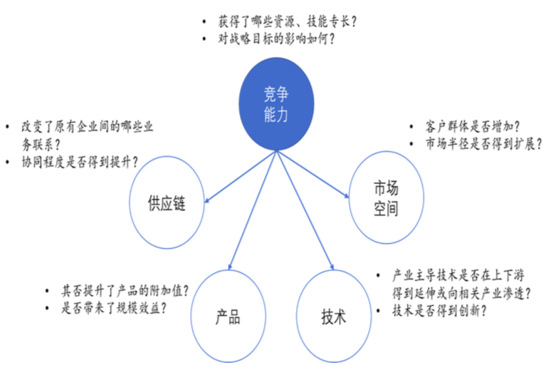 产业整合的相关理论研究观点丰富,较有代表性的一是从市场的资源配置效率出发的“结构—行为—绩效”分析范式,主要考察市场集中度、进入壁垒、产品差别化程度等市场结构状况对企业价格和产量决策的影响;二是从交易费用理论出发,以成本节约的程度与资产专用性程度、资产被利用的频繁程度和环境的不确定程度等因素分析产业整合的价值;三是从企业能力理论出发,解释产业整合是重新调整企业间能力分布,从而带来经营价值的过程。各种理论多来自产业经济学的经典理论,也不乏诺贝尔大神的加持,确实带来很多有益的启示,欧博官网ABG从经典理论研究和咨询实践出发,提出了“1+4”产业整合评估模型,既一个核心,企业竞争能力得到了哪些增值,四个影响维度,从供应链、产品、技术、市场空间具体分析产业整合所带来的预期增值是什么。其中,企业产业整合的核心是竞争能力的提升,以解决战略实现的过程性问题,因此需要从战略任务和外部市场环境的角度对并购的价值做出考量,同时,所有的产业并购行为,必然带来产业链的具体变化,而这些变化也将成为竞争能力提升的具体外延,变化的程度和质量则直接决定竞争能力增值实现的多少。