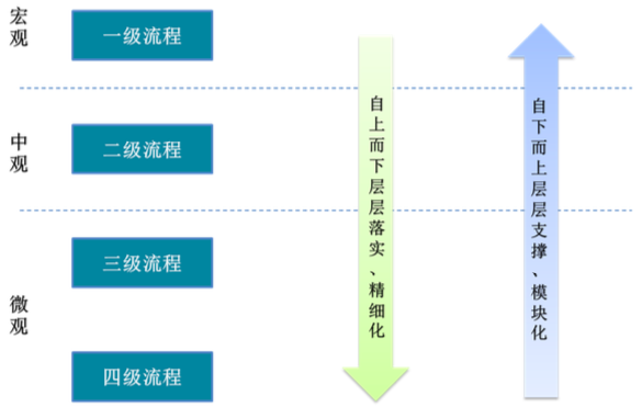 企业管理必然依托于一定的层级关系开展,下图直观展示各级流程间关系,从一级流程到四级流程,是自上而下的层层分解落实、精细化的过程,从四级流程到一级流程是自下而上层层支撑、模块化的过程。它们系统构成了企业管理不同层级的管理单元。