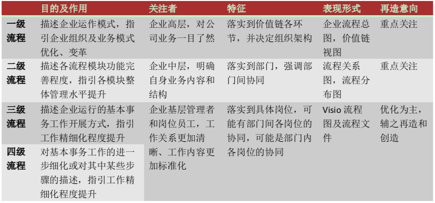 流程具有典型的层次性特征,不同层级的流程,其功能不同,以下表格分别从流程的目的及作用、关注者、流程特征、流程表现形式、流程再造意向五个方面进行了详细对比,希望能够使读者能够更加深入的理解为何要对流程进行分级。