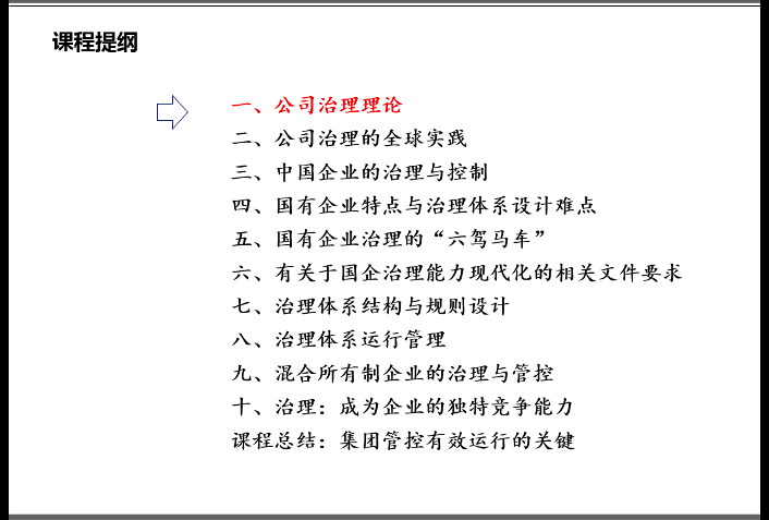 作为从事公司治理培训达15年的资深讲师,段磊博士的课程从福特与康柏的故事开始,首先介绍了公司治理的理论体系、全球实践、中国企业的治理与控制模式、国有企业特点与治理体系设计难点,在此基础上,系统介绍了国企治理体系设计所依据的政策与文件精神,以及国企“六驾马车”治理体系的结构设计、规则设计与运行管理体系设计。同时,基于混合所有制改革日益深入的趋势,专题介绍了混合所有制企业的治理与管控方式,最后,以三家优秀国企治理体系的设计与运作作为结尾,深刻地提出了“让公司治理成为企业独特竞争能力”的论断。