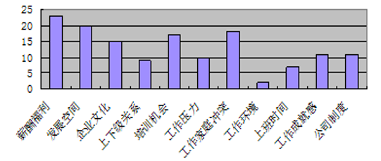 调研前,通过与人力资源部初步了解,S公司员工流失的原因是多方面的,既有公司的原因,也有员工自身的原因;有些原因是公司可控的,有些是无法控制的。因此,调研机构把员工离职的原因定位于企业内部,设计了主要包括薪酬福利、发展空间、企业文化、上下级关系、培训机会、工作压力、工作家庭冲突、工作环境、上班时间、工作成就感、公司制度等十一项内容的面谈问卷。在与离职员工面谈沟通的过程中,通过善意的引导,尽可能获得离职人员的真实想法。同时,调研机构会详细记录面谈的内容,并对面谈结果进行了统计(见下图)。