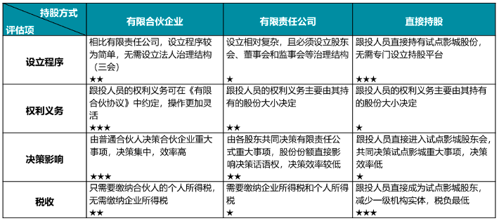 一般来讲采用合伙企业是最好的持股方式,享受税收优惠,分配机制灵活,有限合伙的收益或利润分配完全由合伙人之间自由约定,不受出资比例的限制。