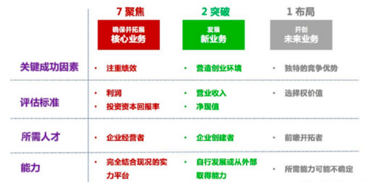 通常的资源配置比例为:“七二一”原则,即70%的资源投入到聚集业务,20%的资源投入突破业务,10%的资源投入布局业务上。