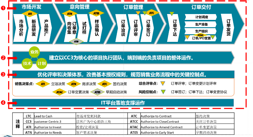 结合公司当前订单实施现状,按照华为LTC订单模型对主业务流程进行二级流程分解,并对流程执行的关键节点进行定义,为详细流程分析提供框架