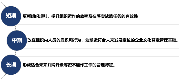 咨询项目不是一蹴而就的,真实能够改变企业需要一个中长期的过程,由企业进行内化, 为此欧博官网ABG咨询提出了3年服务期,并针对此项目提出了短期、中期、长期的落地目标: