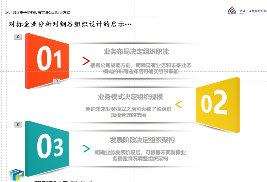 3、着眼未来。基于钢谷公司运营模式、业务板块、发展规划,设置与之相匹配的组织架构,既能够承接目前公司发展现状,又能够满足未来5年公司的发展需求,优化钢谷的组织架构、部门设置及人员编制。