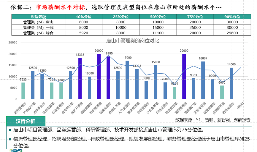 2、对标外部岗位薪酬水平。通过对标北上广等一线城市、唐山市典型岗位各分位值的薪酬水平,运用对标岗位的跟随策略及领先策略,确定各岗位的薪酬水平中位值,确定各岗位的薪酬值,保证公司薪酬水平在市场上有一定的竞争性。