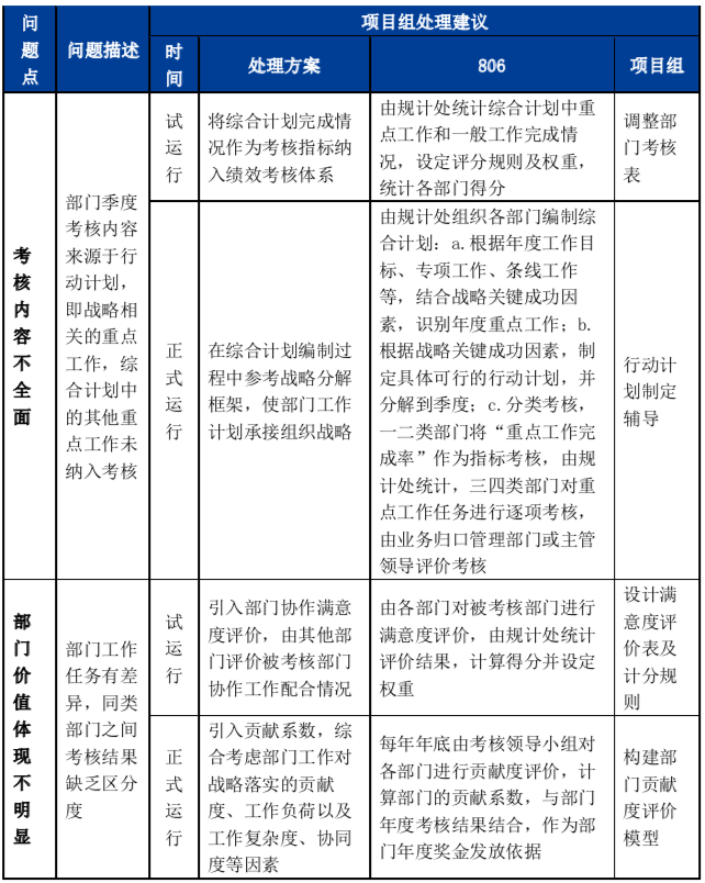 围绕关键成功因素,制定实现关键成功因素的行动计划。行动计划是把关键成功因素转化为具体、可实施的行动举措,并明确行动举措的完成时间、完成标志及责任人。行动计划一方面可将结果性指标分解、细化为具体工作任务,作为过程指标,使指标兼顾过程和结果;另一方面可将部门工作任务落实到人,为岗位考核提供基础,实现组织目标的层层落地。