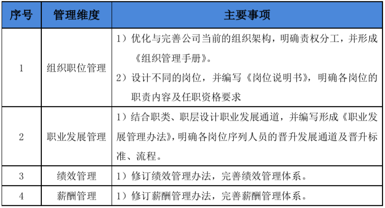 根据调研,本次绩效薪酬体系优化工作主要集中在组织职位体系梳理、职业发展通道设计、薪酬结构优化、考核模式与指标体系优化等方面。