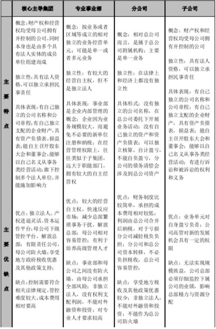 以上四种典型组织架构差异化的核心在于中间层的二级组织的设置问题,二级组织主要是以核心主导集团、事业部、分公司与子公司四种组织方式存在,各方式的特征如下: