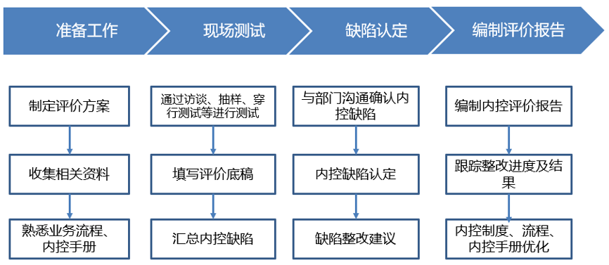 本次内控评价流程包含四个工作步骤,涵盖了内控评价开展过程中的各项具体工作,实现了从制定评价方案到内控测试、缺陷跟踪、制度流程更新等完整闭环。